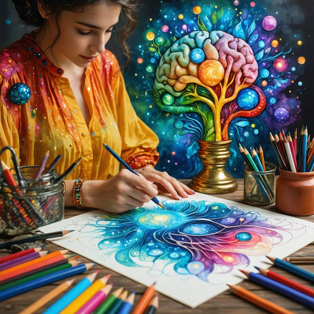- Нейролинии — плавные, изогнутые линии, которые соединяют разные части рисунка, символизируя новые нейронные связи.